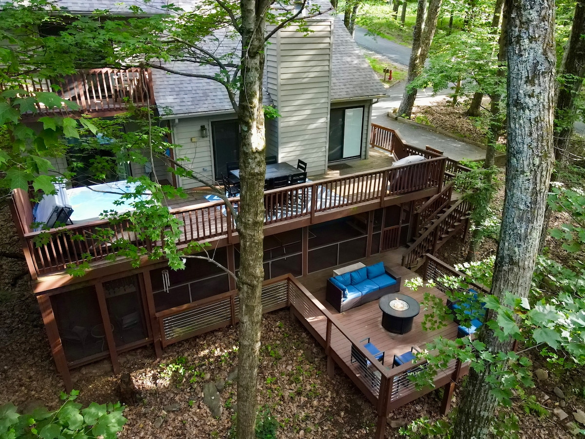 ¡Te damos la bienvenida a Blackrock Escape! Casa de montaña de 2 dormitorios/2,5 baños que admite perros en una ubicación privilegiada en Wintergreen Resort. A 3 minutos en coche de Mountain Inn. Camina hasta las rutas de senderismo: el sendero Plunge Trail/Blackrock Park está a solo 2 minutos a pie. Dos dormitorios en el primer piso, ambos con colchones Helix tamaño king, televisores inteligentes y baños en suite. Chimenea de leña, juegos, rompecabezas, TV inteligente de 65 pulgadas en la sala de estar. Dos terrazas con parrilla de gas y jacuzzi. Cafetera Keurig K-Duo y lavavajillas en la cocina. Lavadora y secadora de tamaño completo.