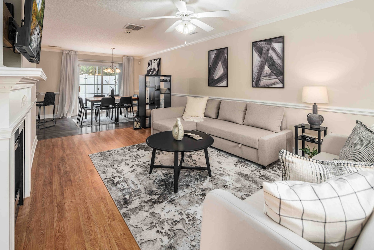 Disfruta de una experiencia elegante y relajante en este céntrico alojamiento. Unidad final de una sola planta en un pequeño complejo tranquilo a pocos minutos de excelentes restaurantes, tiendas, ECU, el centro de la ciudad o Vidant. (¡A menos de 2 millas de ECU!) Dormitorio principal con cama tamaño king y gran baño en suite con lavabos dobles. Segundo dormitorio con cama tamaño queen. Televisores inteligentes en ambos dormitorios y sala de estar con aplicaciones de transmisión, la televisión de la sala de estar también puede acceder a todos los canales principales a través de YouTube TV con nuestro inicio de sesión.