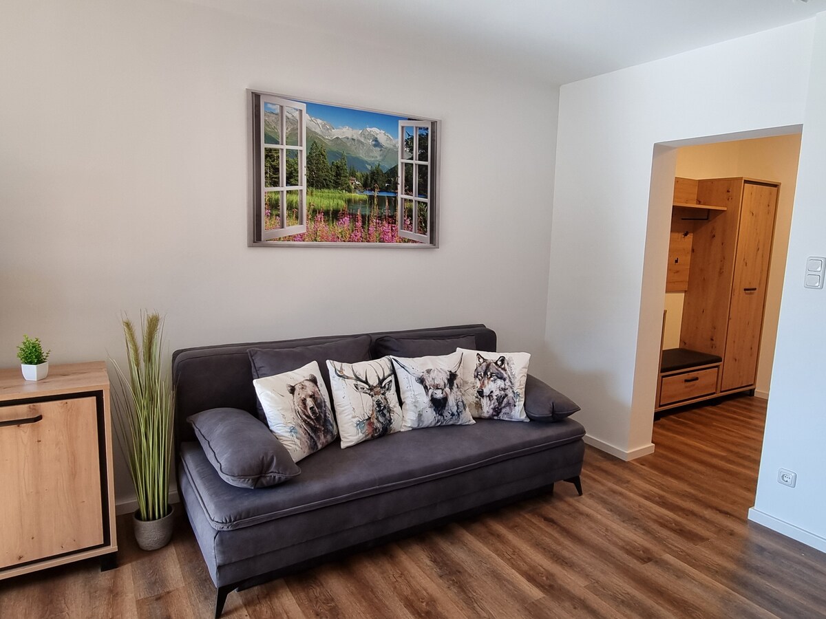 Moderno y funcional. El apartamento está situado en un anexo detrás de la casa. El jardín es solo para los huéspedes. Si es necesario, se puede hacer una barbacoa allí y se puede comer en la terraza. Las estaciones de autobús a los pueblos vecinos están a 200 m. El apartamento es el punto de partida para excursiones en bicicleta de montaña y excursiones en bicicleta en todas las direcciones.