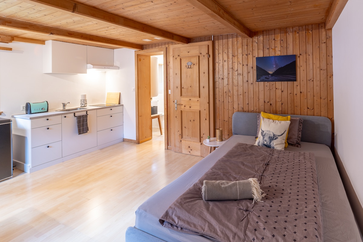 Estudio moderno en una casa de nueva construcción con impresionantes vistas a las montañas. Situado en el centro de Davos, junto al lago, góndola, senderos para bicicletas o rutas de senderismo. Puedes disfrutar del sol por la mañana o ver las cimas rojas de las montañas durante las puestas de sol desde la cama. Una cocina nueva y totalmente equipada y una gran ducha ofrecen mucha comodidad. Situado a solo 5 minutos de Bahnhof Dorf. Opciones para dormir: cama loft (160x200 cm)