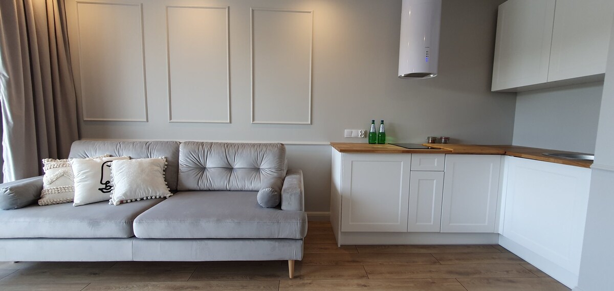 Un elegante estudio con una superficie de unos 25 m², diseñado para dos huéspedes adultos que valoran la comodidad y la proximidad al mar. El apartamento está ubicado en un moderno complejo ApartPark, a pocos pasos de la playa y del bullicioso paseo marítimo. El interior ha sido diseñado en un estilo moderno y equipado con una cómoda cama tamaño queen, una cocina americana funcional con equipo, un baño con ducha y un balcón. Además, los huéspedes también tienen acceso a wifi rápido y TV.