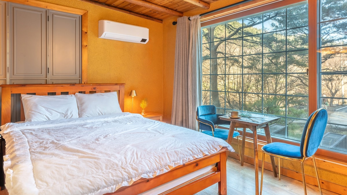 un bonito jardín rodeado de pinos, Esta cabaña tiene unas vistas espectaculares de la colina cerca del lago. 2 camas tamaño queen + 1 colchón adicional incluido Se puede agregar el topper plegable (consulta separada) La ropa de cama, como las fundas de almohada, se lava todos los días y, en los días de buen tiempo, se seca naturalmente a la luz del sol. Estufa de leña interior (leña incluida) Parrilla al aire libre (Gratis si preparas carbón vegetal por adelantado, 10,000 won por separado previa solicitud para carbón vegetal) 2 habitaciones, sala de estar, 1 baño Se pueden organizar más huéspedes, así que ponte en contacto con nosotros por separado ^ ^ Para estadías de más de una semana, se te cobrará una tarifa de alojamiento con descuento y una tarifa de calefacción real. < Destinos cercanos > Excelente ubicación para ir a pescar en Daedeok Reservoir (10 minutos a pie) 11 campos de golf a 10 km Central Tower Park Carta matutina desde Altitude Won Tangeumdae Cataratas de Suryong Valle de Hakbawi Suju Palbong Runok Cave