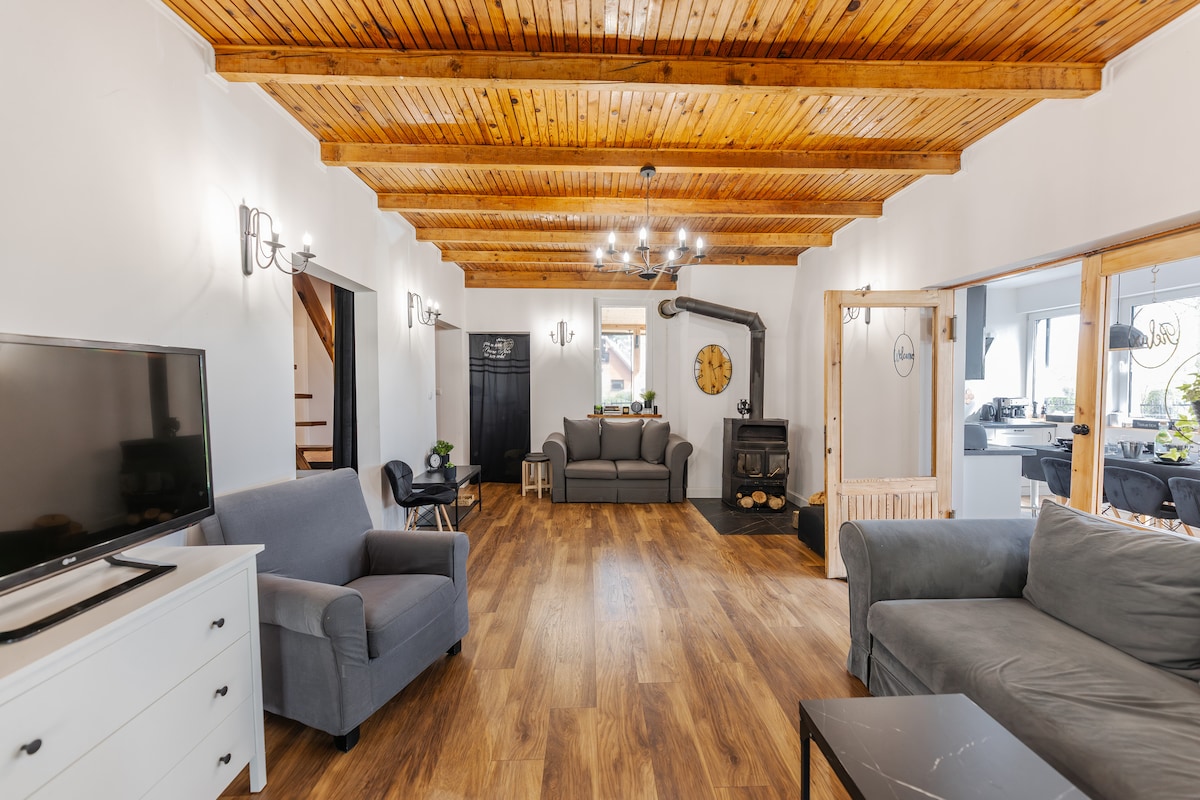 Enjoy real privacy in our comfy 120m² wooden house, 2,000 m2 plot, fenced, just 2 hours from Warsaw. Near a calm river (100m) and friendly forest (200m). Inside, chill by the fireplace, and sunny bedrooms await. Outside, explore woods, relax by the river, and enjoy the yard's seclusion. Plus, feel totally private on the garden terrace with a heated jacuzzi – a spot where you can be yourself without others looking. Great for peace-lovers, nature fans, and pets. Book now for a private getaway!