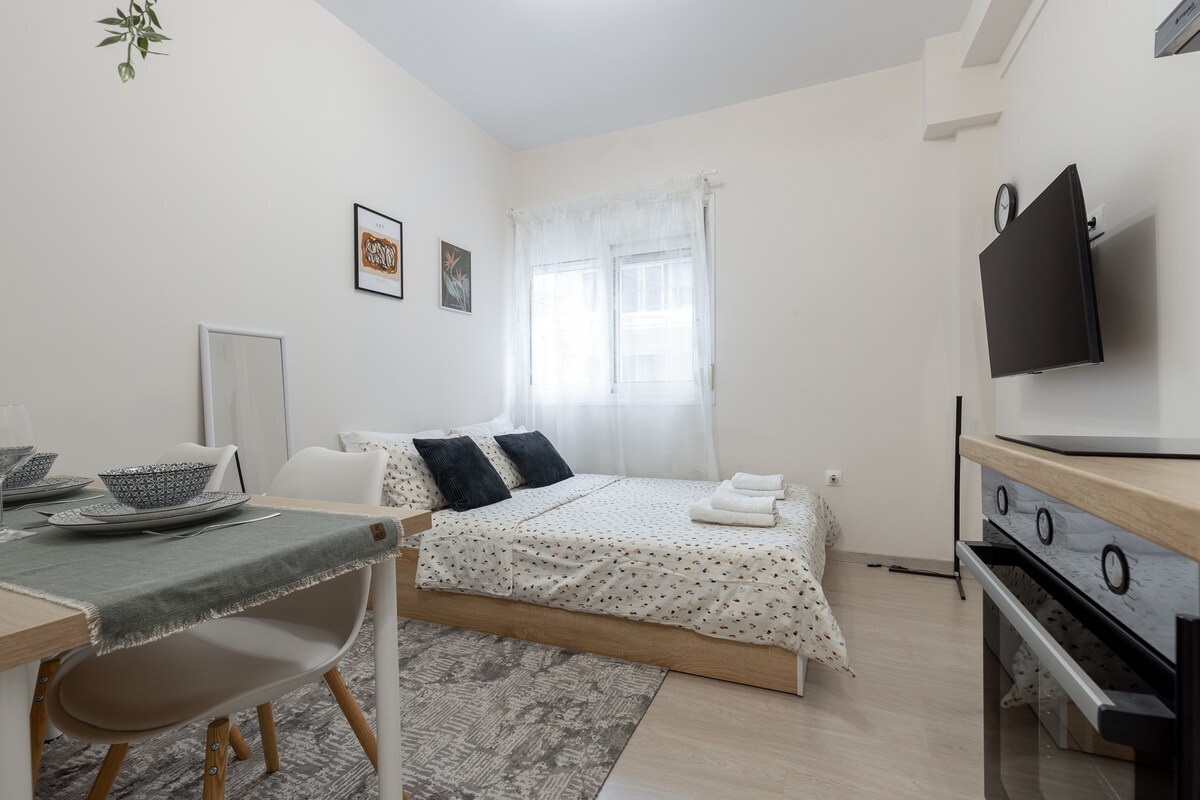 Acogedor estudio en el centro de Xanthi. Ideal para una pareja o viajeros solitarios. Tiene una cama doble, una cocina totalmente equipada, WiFi y TV 4K. Cerca de tabernas, cafeterías y supermercados. Registro de entrada sin restricción de horario.