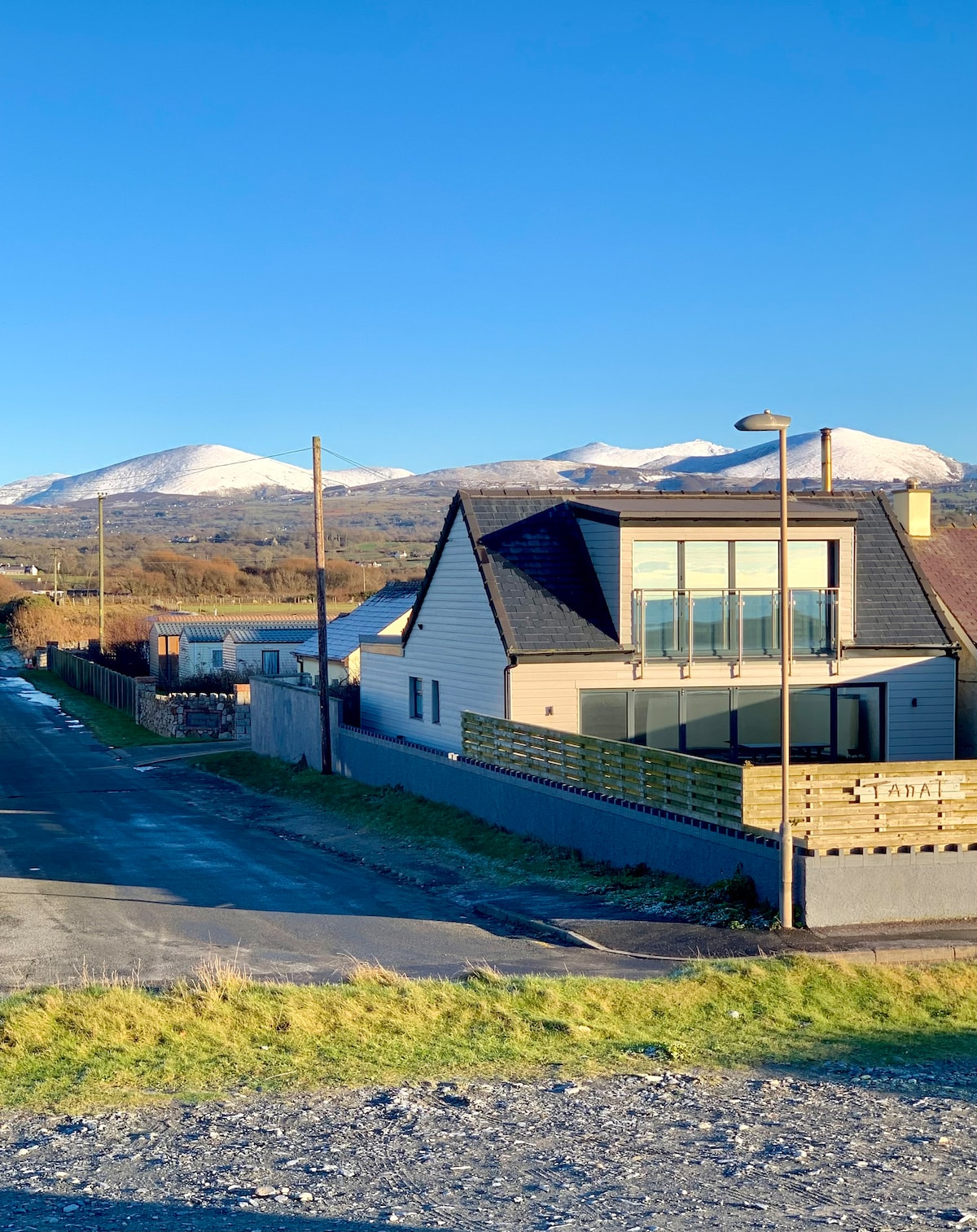 Impresionante casa de playa contemporánea a pocos segundos a pie de una galardonada playa con bandera azul. ¡Con vistas al mar, a la hermosa península de Llyn, a Anglesey, a un castro de la Edad del Hierro y a la absolutamente impresionante cordillera de Snowdonia! Nuestra casa de playa se llama Tanat y ha sido diseñada para disfrutar de sus impresionantes vistas a la montaña y al mar. Las enormes puertas plegables en ambos pisos abren la parte trasera de la propiedad al jardín y a esas increíbles vistas al mar y atardeceres.