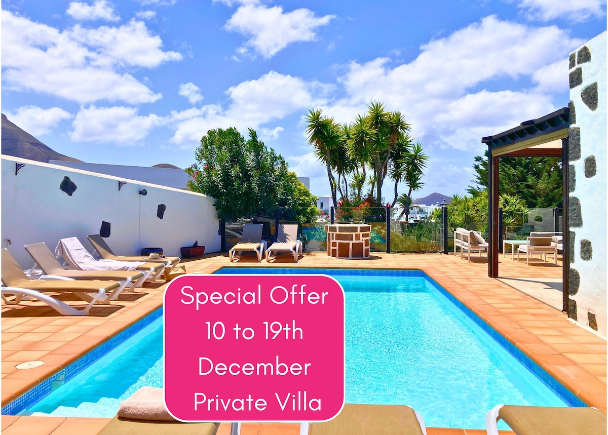 Casa Eloísa está situada en La Asomada con impresionantes vistas hacia el mar y las islas de Fuerteventura y Lobos. Dispone de 2 dormitorios con baños integrados, sin ningún tipo de barreras, cocina y salón y vistas a una piscina interior, cerrada y climatizada a 24 g.octubre a abril ( no es un Spa), con una enorme terraza. Los dormitorios, cocina- salón y piscina dan al exterior con enormes cristaleras y luz natural. Construida en una única planta. Independiente y con parking exterior gratis.