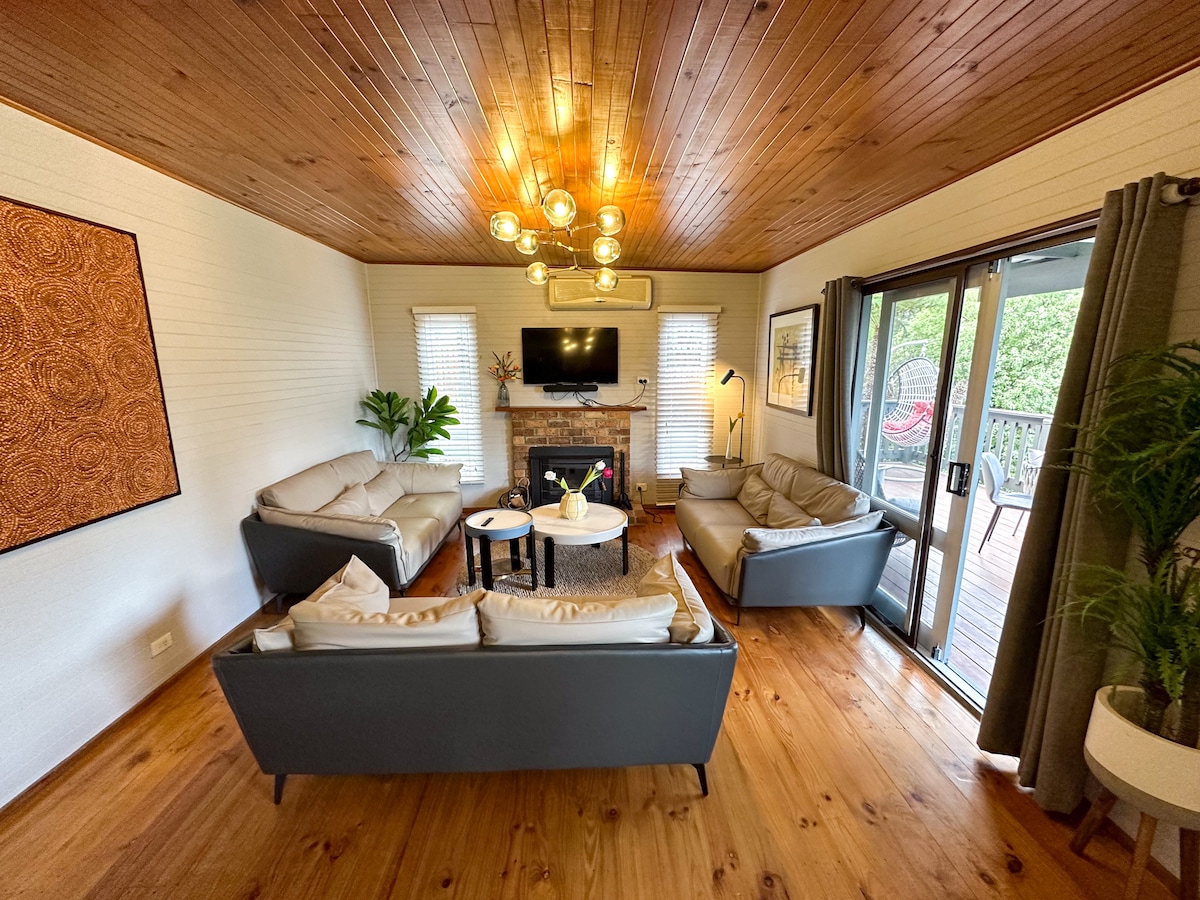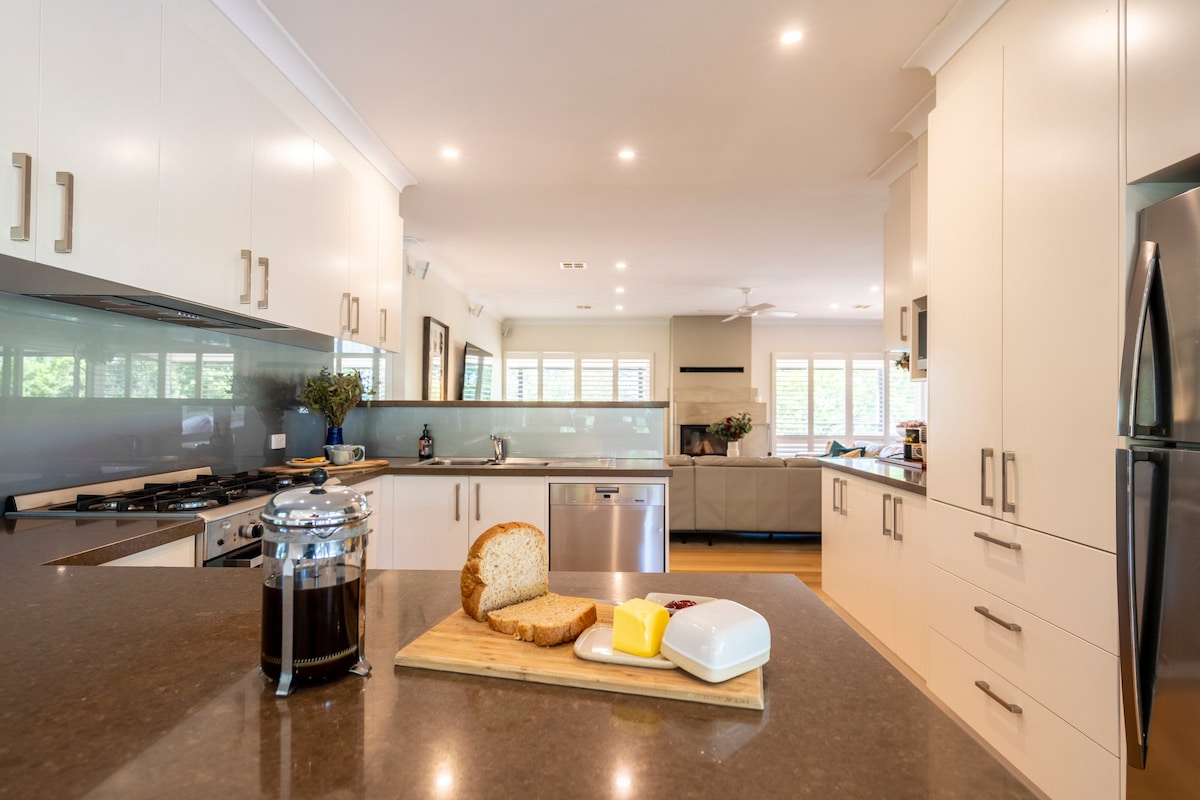 Escápate al paraíso definitivo del entretenimiento en esta casa de diversión totalmente renovada: 4 televisores, spa, sauna, mesa de billar de tamaño completo, mesa de ping-pong, mesa de póquer, 3 fogatas, comedor al aire libre, barbacoa, «cueva de hombres», cocina de chef, jardines, vistas y conoce a los lugareños como cacatúas, canguros y conejos en los jardines. 4 camas con 3 divididas en camas tamaño king: ¡capacidad para 7 personas en lujo total! Despiértate con el canto de los pájaros y los canguros pastando justo fuera de tu ventana.