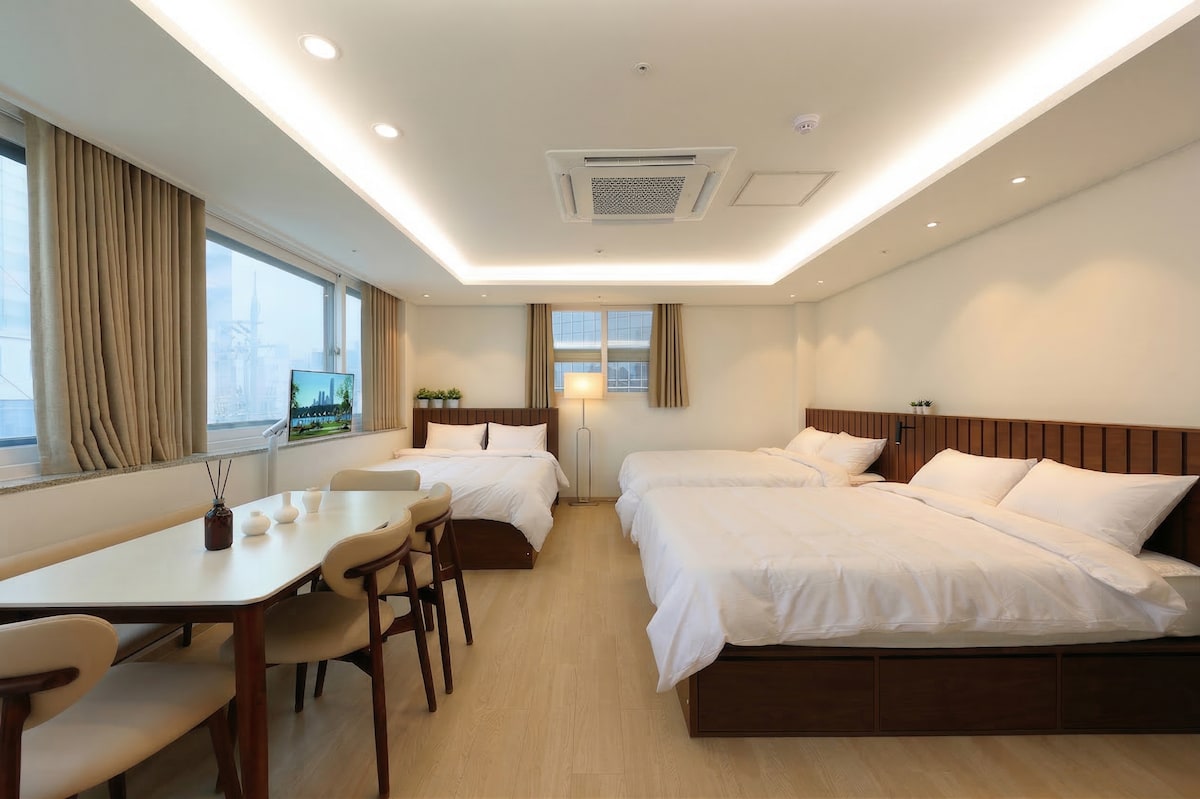 Habitación familiar con dos camas y ventana grande, con Netflix (estación Myeongdong a 1 min)