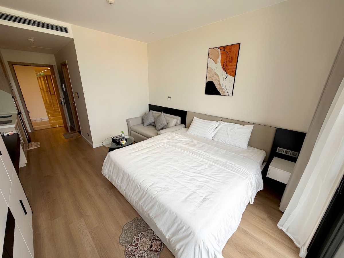 Thức dậy với ánh nắng dịu nhẹ và khung cảnh biển xanh ngay trước mắt trong căn hộ rộng rãi, tràn ngập ánh sáng tự nhiên. Từ chiếc giường êm ái, bạn chỉ cần nghiêng nhẹ đầu là có thể tận hưởng toàn bộ vẻ đẹp của đại dương qua ô cửa kính lớn bao trọn mặt biển. Căn hộ được trang bị bếp đầy đủ dụng cụ nấu nướng.Góc bàn ăn xinh xắn bên cửa sổ là nơi tuyệt vời để thưởng thức bữa sáng, nhâm nhi cà phê. Một chiếc sofa thoải mái cạnh cửa kính tạo thành góc thư giãn lý tưởng – đọc sách, nghe nhạc.
