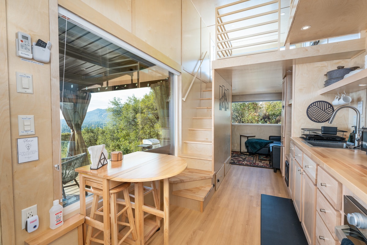 Enjoy tranquility in our Tiny House located on a rural mountaintop ridge, offering amazing sunsets! 400 sqft, two-story mini haven boasts an upstairs loft with 2 queen beds, fully stocked kitchen, bathroom, cozy living room & panoramic windows offering awe-inspiring sunsets. We are a scenic 24 mile drive from Yosemite's South entrance, 15 miles to Bass Lake and approx 8 miles to downtown Oakhurst. Features include all modern comforts, an outdoor grill, deck, firepit and high speed Internet!
