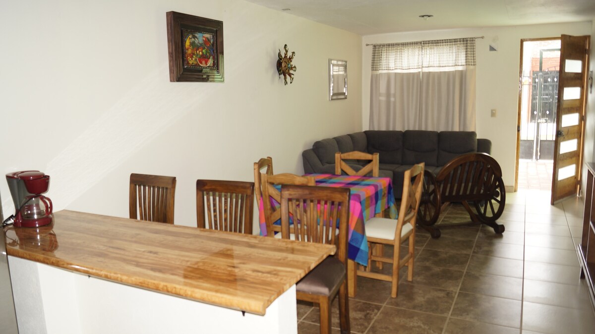 La casa es un espacio acogedor y confortable, en ella podrás encontrar una cocina integral con algunos aditamentos si deseas cocinar algún aperitivo. También cuenta con dos habitaciones, cada una con cama matrimonial, closet amplio, cobijas,toallas burós y suficientes conexiones de electricidad para que tu estancia sea agradable. Cuenta con comedor para cuatro personas, refrigerador mediano en excelentes condiciones, baño con regadera, un patio trastero con lavadero y cochera para un vehículo.