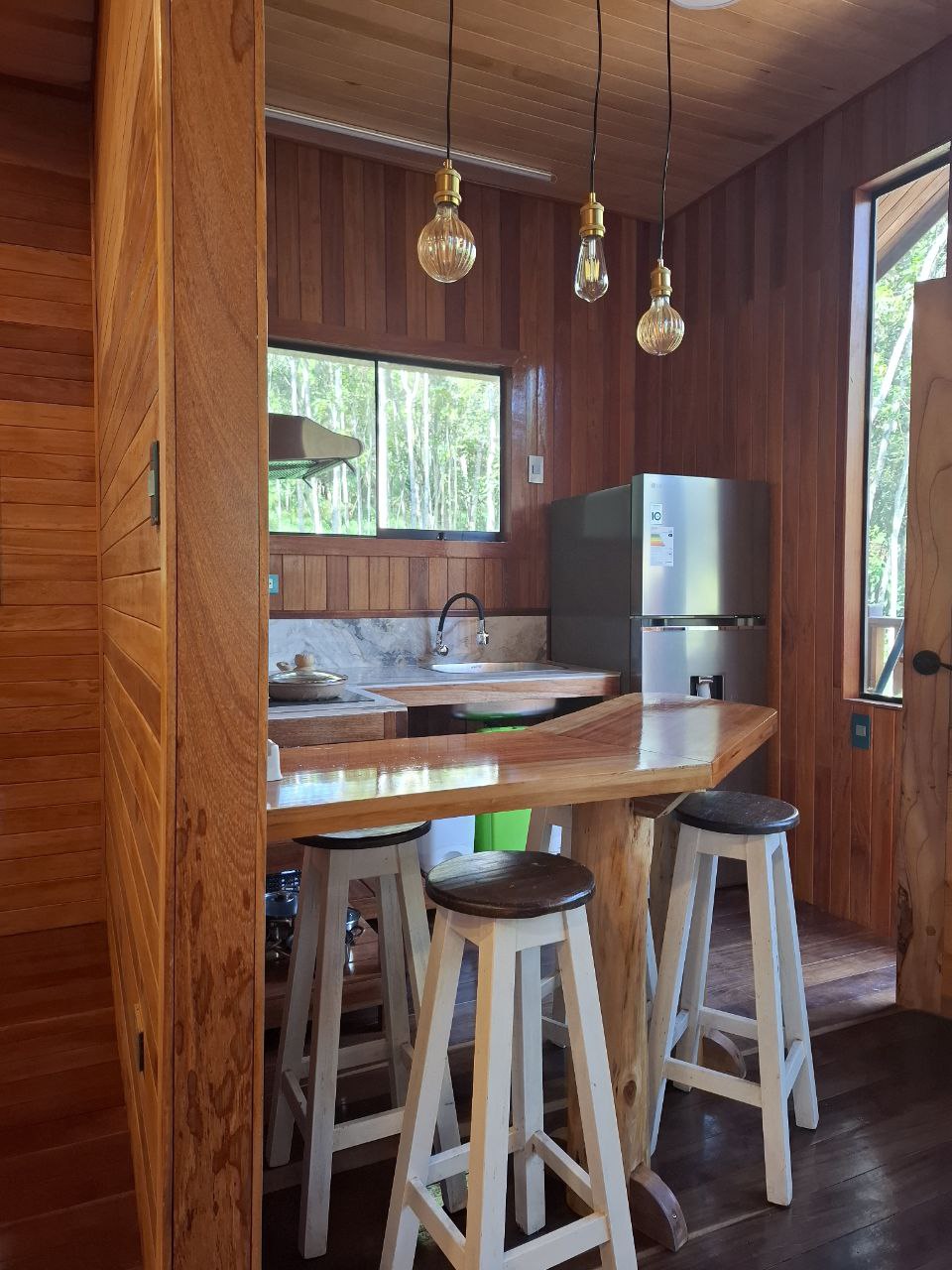 Relájate en este espacio tan tranquilo y elegante en contacto con la naturaleza, rodeado de árboles altos y antiguos que cantan con el viento, viendo a las aves, luciérnagas y las estrellas desde nuestras terrazas amplias en cómodas tumbonas acolchadas o desde dentro por nuestros amplios ventanales y mamparas. Cocina cómodamente con todos los artefactos necesarios, disfruta de tus películas favoritas en una amplia sala o trabaja con un WiFi estable a un paso del bosque y 10 min de la ciudad.