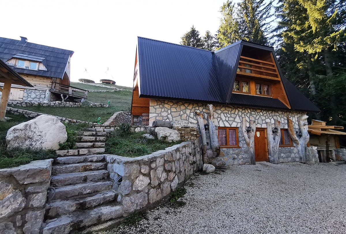 Un alquiler vacacional tranquilo hecho de materiales naturales de piedra y madera, al borde del bosque cerca de lagos de montaña y senderos de senderismo. Excepcional punto de vista a una altitud de 1530 metros desde donde se pueden ver todas las montañas Durmitor. Hay lugares para socializar, casas de verano vacacionales, un parque infantil y zonas con barbacoa. Senderismo, rafting Tara, cañón, barranquismo, mountinbike, excursiones en avión se pueden organizar en la propiedad...