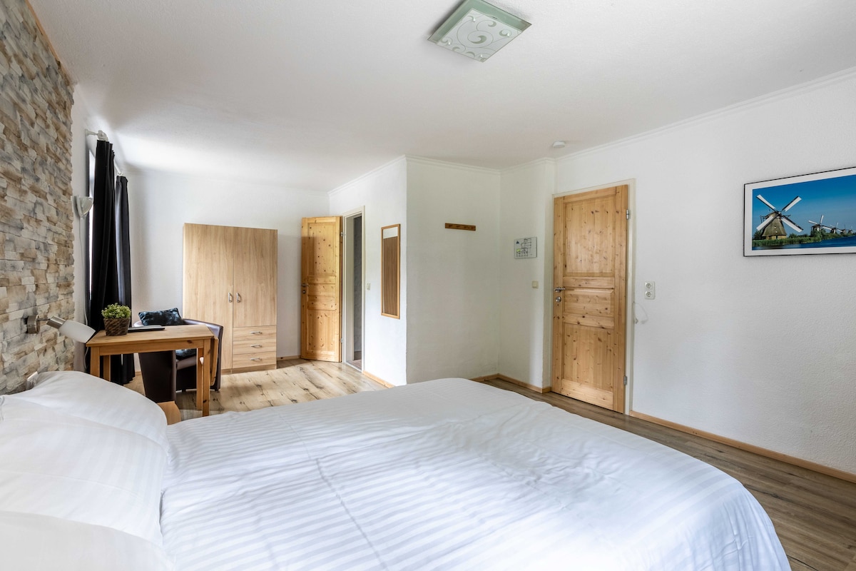 Nuestras cómodas habitaciones individuales ECONÓMICAS con cama doble (160x200 cm) acaban de ser recientemente renovadas. Las habitaciones tienen un baño con bañera, inodoro, secador de pelo, caja fuerte, televisión por cable con pantalla plana, teléfono, WLAN gratuito y ventanas insonorizadas. Es posible que una segunda persona duerma en la cama (cargo adicional). Por favor, ponte en contacto con nosotros antes por correo. Las mascotas están en esta categoría de habitación debido a que no se admiten alfombras.