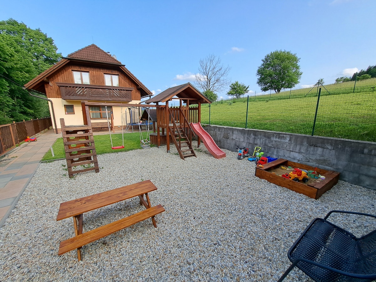 IG: chata_oravienka Una acogedora casa de campo en una zona de casas de campo rodeada de árboles tiene todo lo que necesitas para una estancia cómoda. ¡Hay 3 dormitorios, 2 baños, una cocina totalmente equipada y una sala de estar con TV y chimenea y otros servicios! La casa tiene un hermoso jardín espacioso con una bañera de hidromasaje, una casa para niños, una parrilla de jardín y un cenador. Hay plazas de estacionamiento justo enfrente de la cabaña.