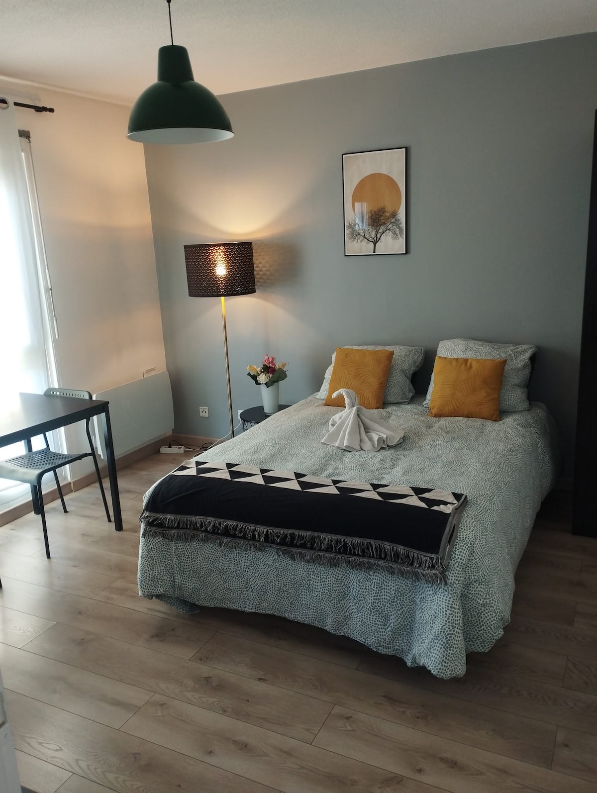 Pequeño estudio de unos 18 m2, situado frente al parque Jacquet. Está equipado con una cama alta (1 plaza) con un sofá cama justo debajo (2 plazas), un baño con inodoro y una pequeña cocina ( vajilla, vitrocerámica, microondas, nevera...). Tiene una pequeña dependencia con una lavadora. Hay televisor. Este alojamiento no es lujoso, pero es muy funcional. Acceso Wifi limitado a 40 GB por semana. Ideal para estancias largas: unas semanas a varios meses.