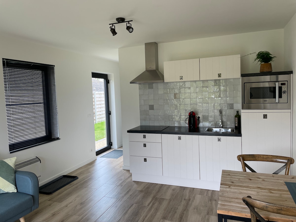 Bienvenidos a d'Ereplatse, un departamento de nueva construcción para hasta 5 adultos en la tranquila Zuienkerke, entre Brujas y la costa. Disfrute de 2 dormitorios, una acogedora sala de estar, una cocina totalmente equipada y un baño moderno con ducha a ras de suelo. Relájese en el salón o en la hamaca. 🚌 Parada de autobús justo en la puerta • 🚴 Bicicletas eléctricas en alquiler • 💰 Sin impuesto municipal